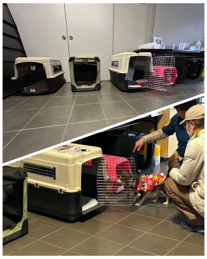 今回は、受け入れる側としては何が必要なのかも事前に色々と打合せをして、準備をしました。受付けまでの誘導、受付けで記入してもらう用紙、避難する時に用意してもらいたいゲージも数種類用意して展示しました。